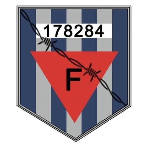 Le fond de cet insigne en forme de blason rappelle la tenue rayée des détenus dans les camps. Au centre, un triangle rouge (attribué aux politiques dans les camps), le tout traversé par un fil barbelé. Au sommet de l’insigne un numéro de matricule 178284.